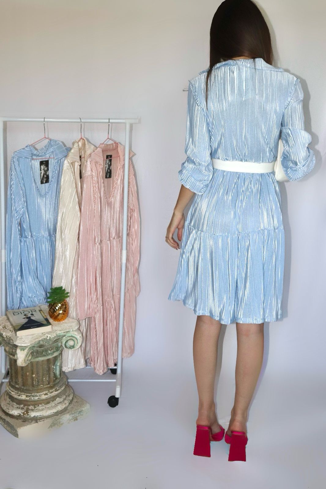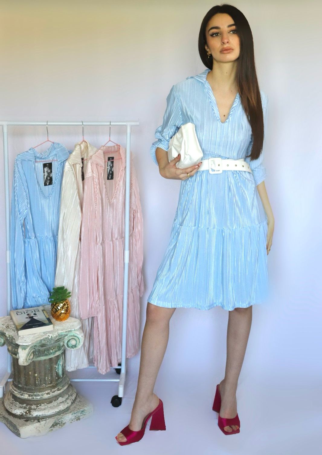 abito plissettato con scollo a V. TG. UNICA da XS ad L📌 Nota importante: Ogni abito che vedete indossato durante i nostri shooting viene adattato e modificato su misura per la modella che lo indossa. 💡