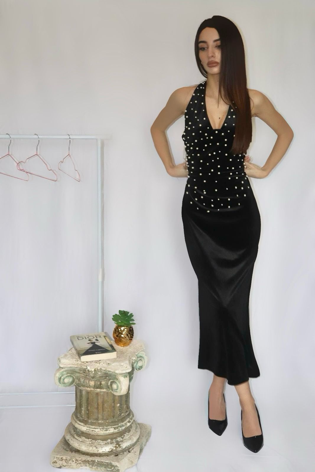 abito in velluto con dettagli di perle, spacco in fondo alla gamba e schiena scoperta, TG. UNICA veste da S ad L