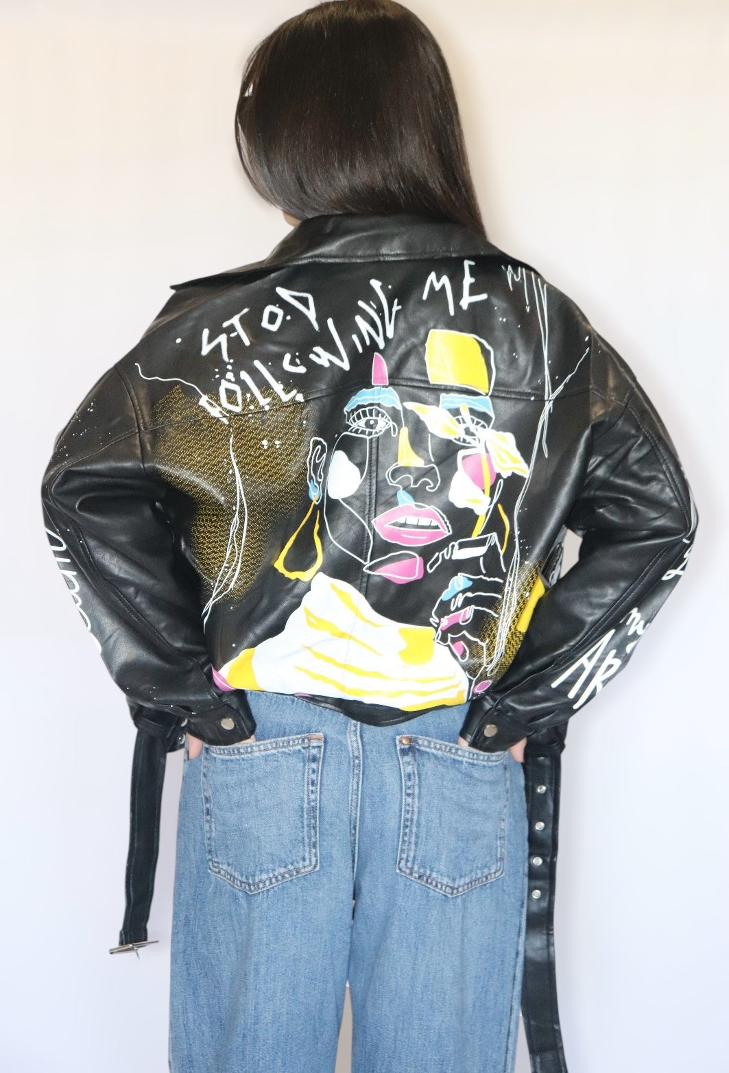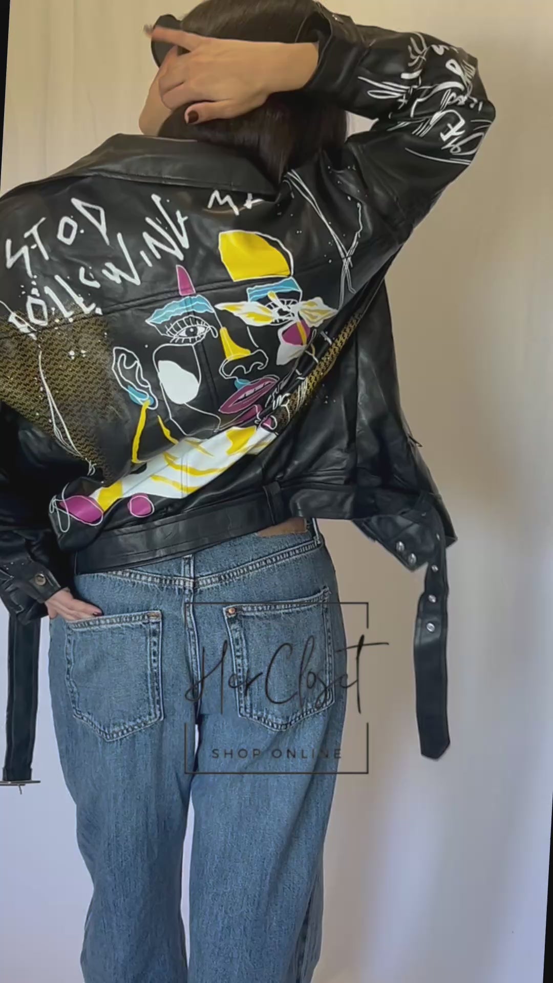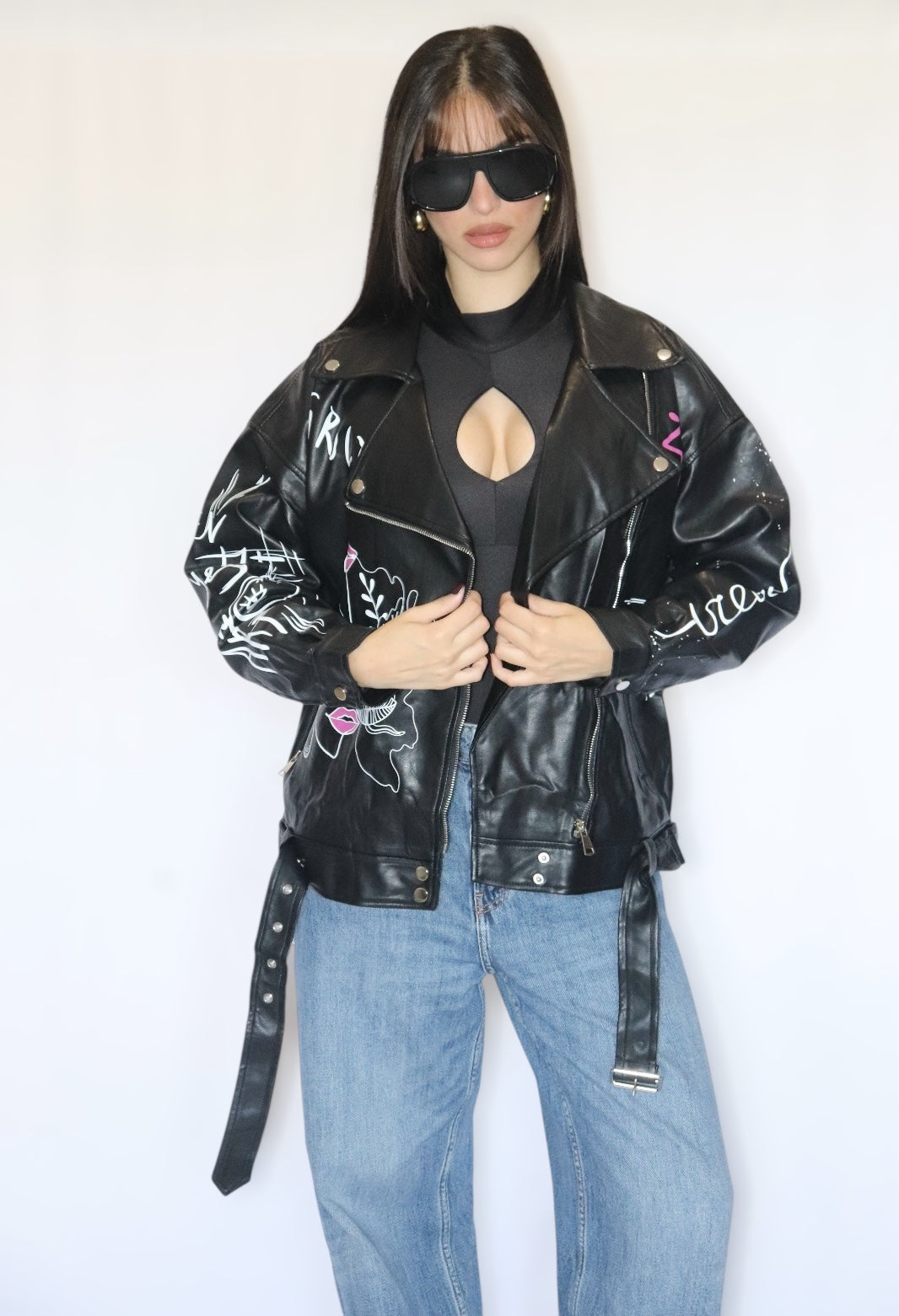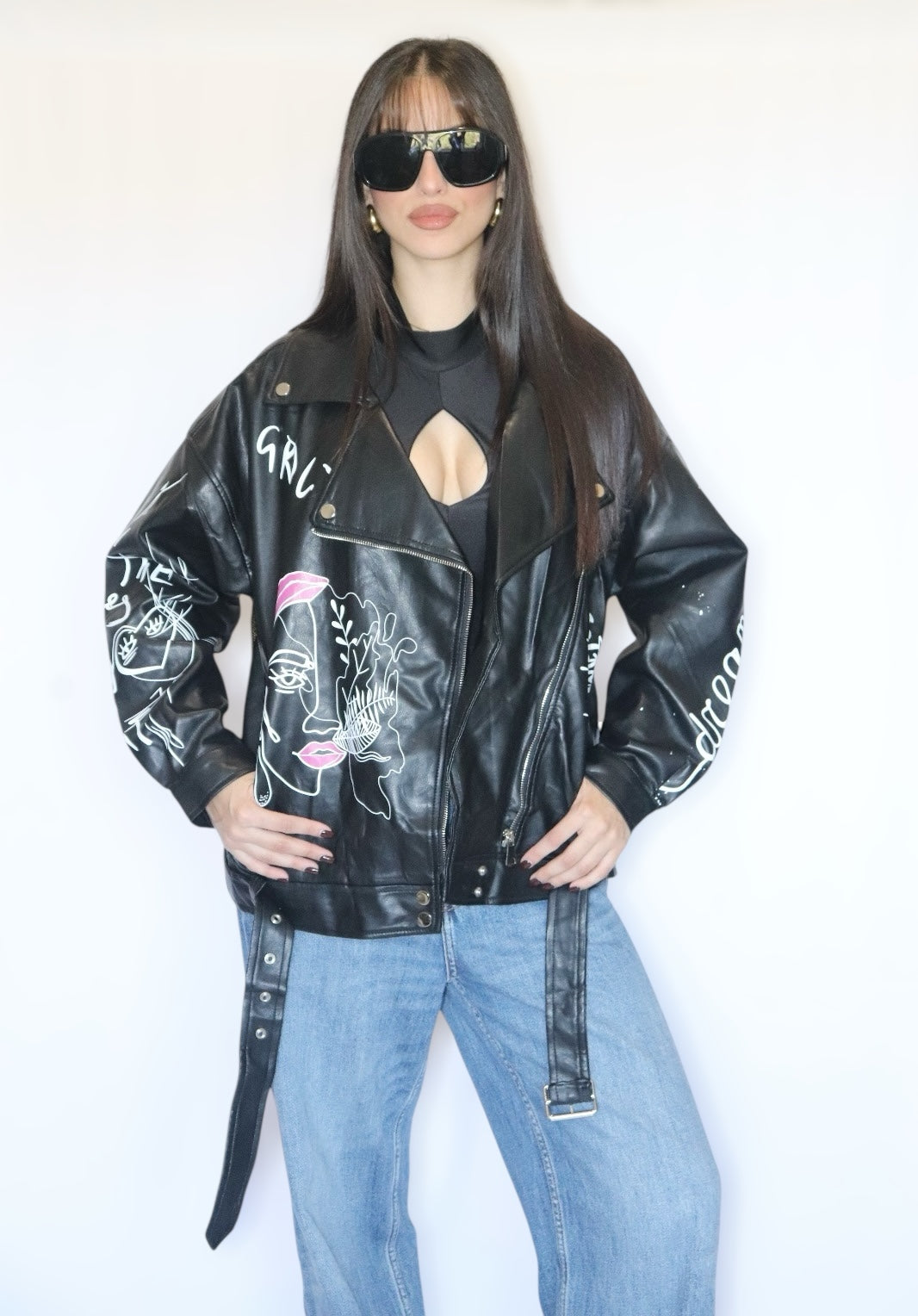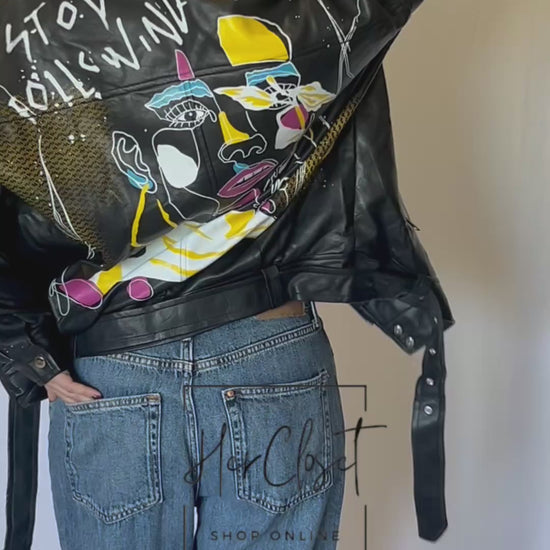 Giacca in simil pelle con stampe colorate, vestibilità oversize.