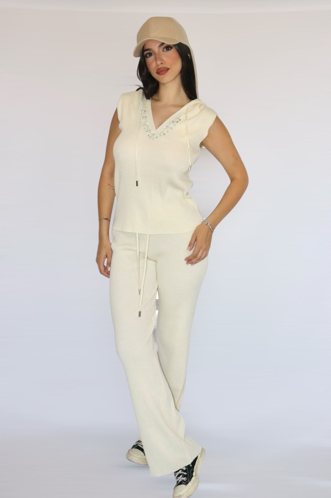 Coordinato pantalone elasticizzato e top elasticizzato con capuccio. presenta applicazioni di brillanti.