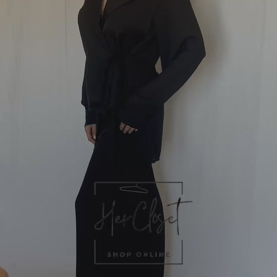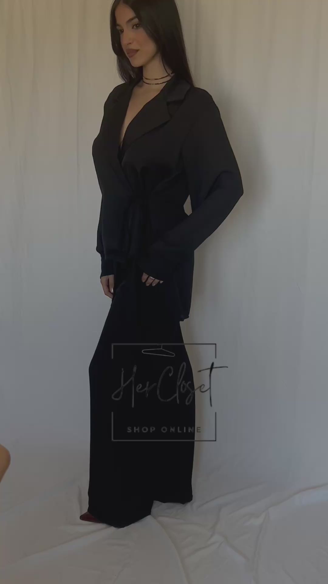Coordinato pantalone e giacca-camicia vestibilità oversize, pantalone elasticizzato con chiusura bottone, giacca con chiusura lacci laterali.