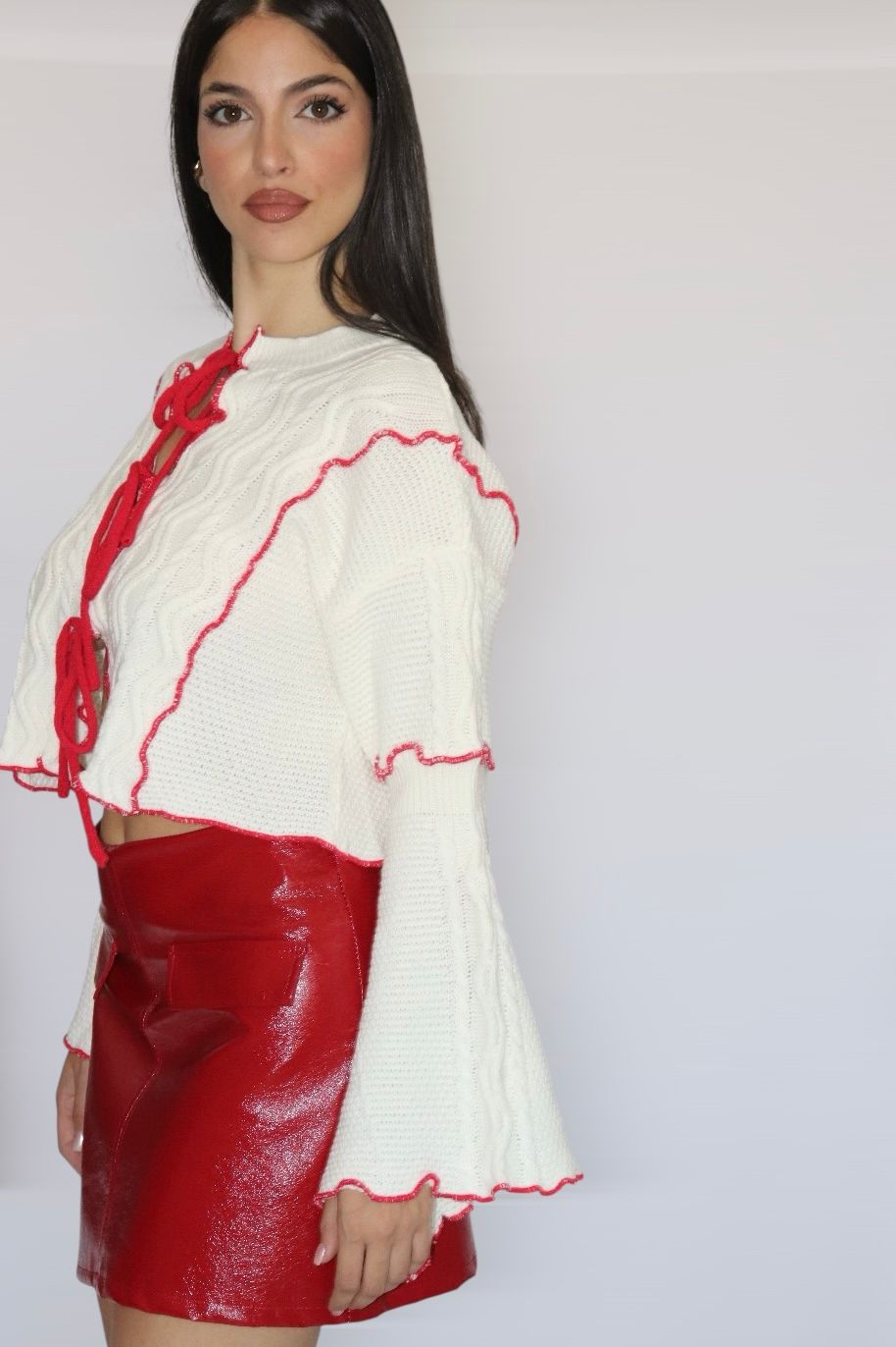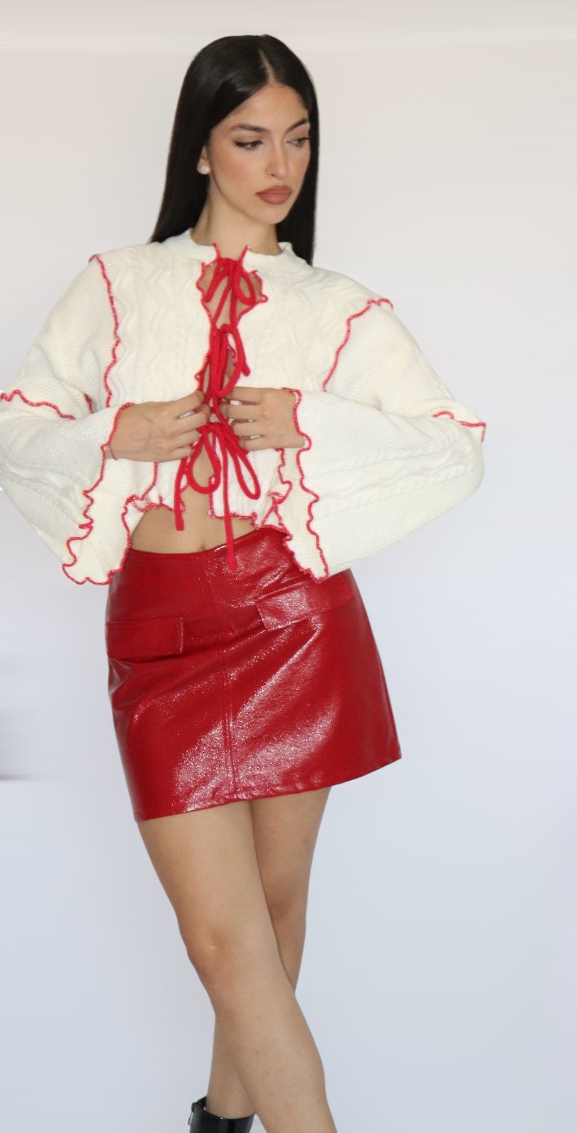 Maglioncino caldo bianco con contrasto rosso, presenta la chiusura con fiocchi.