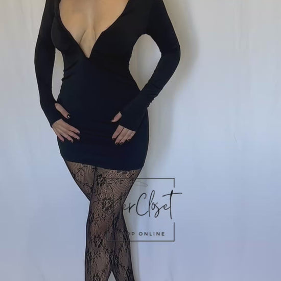 Minidress con polsini giro dito, scollo con ferri rigidi.