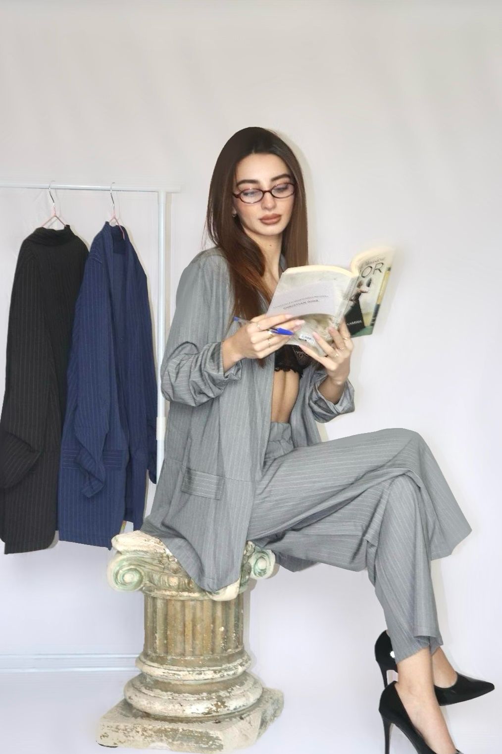 tailleur gessato due pezzi, pantalone palazzo e giacca con maniche arricciate, TG. UNICA, veste dalla XXS alla M