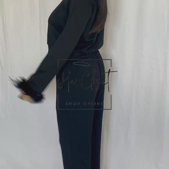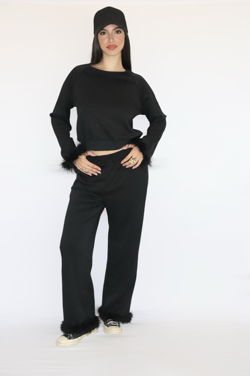coordinato tuta elasticizzata dal fit comodo. presenta dettagli piumati,