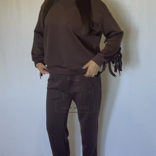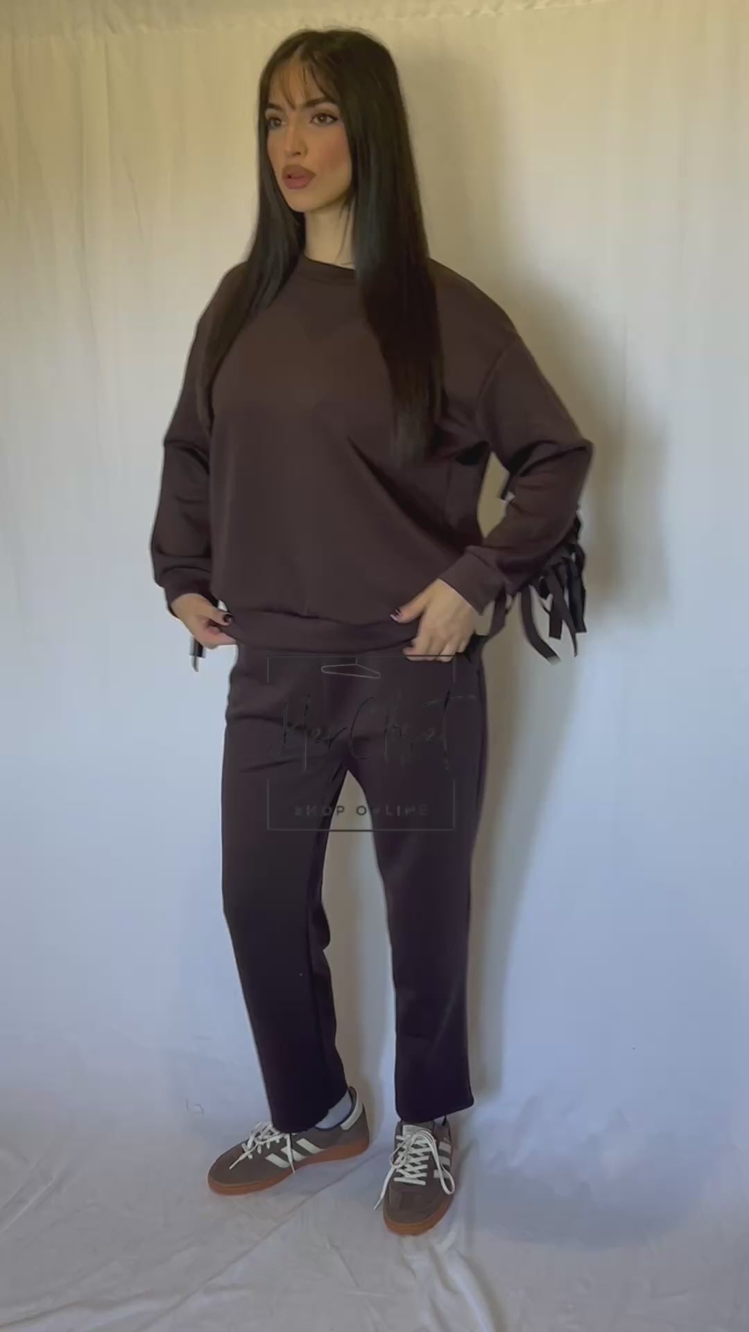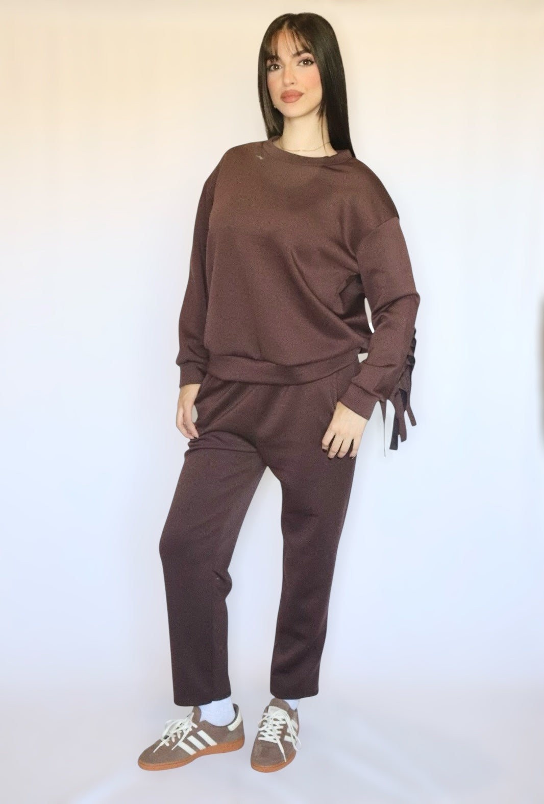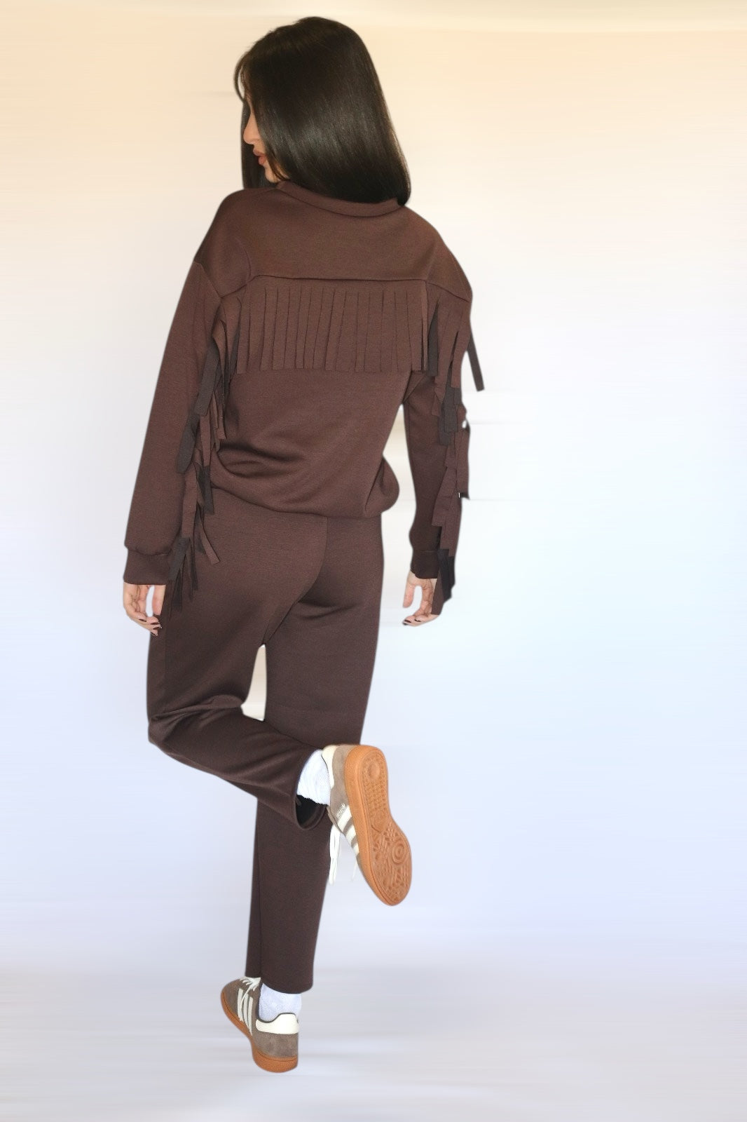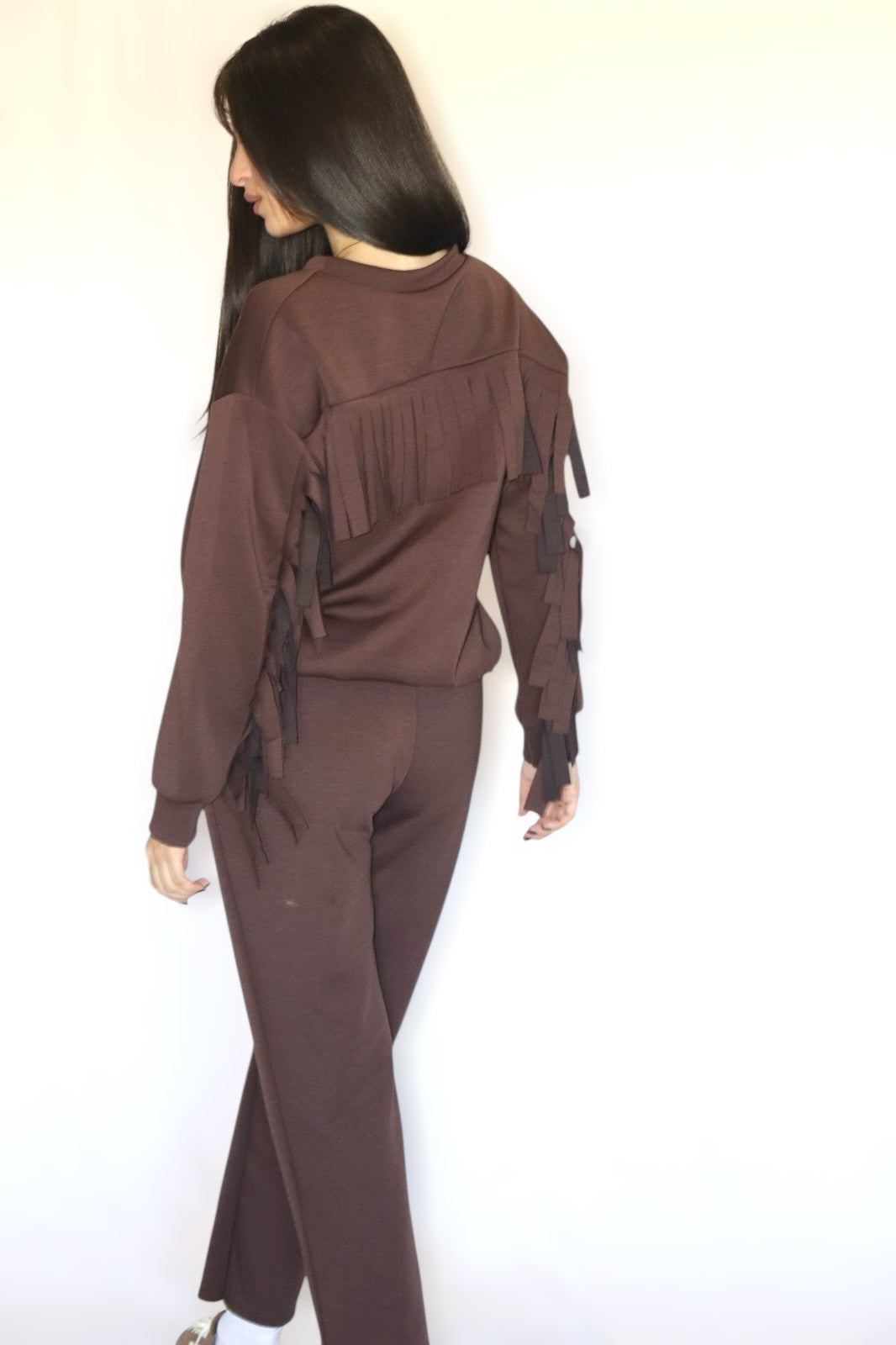Tuta due pezzi, pantalone a sigaretta, felpa con frange.